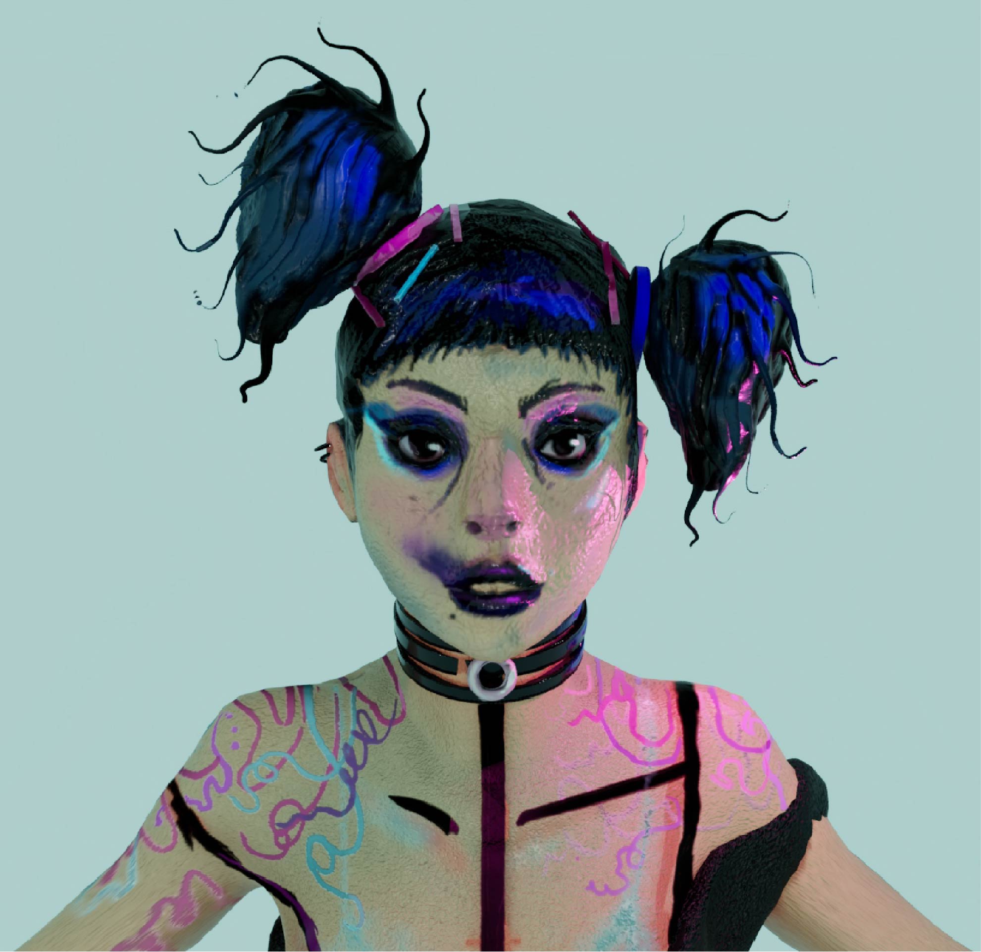 이 캐릭터는 케데헌의 루미 자켓 디자인과 에스파의 상징적인 실버 뿔 모티프를 조합해 탄생한, 한국적 베이비돌 아이돌 캐릭터입니다. 모델링은 마야, 텍스처는 섭페로 진행했습니다.