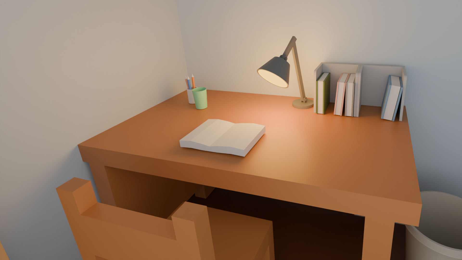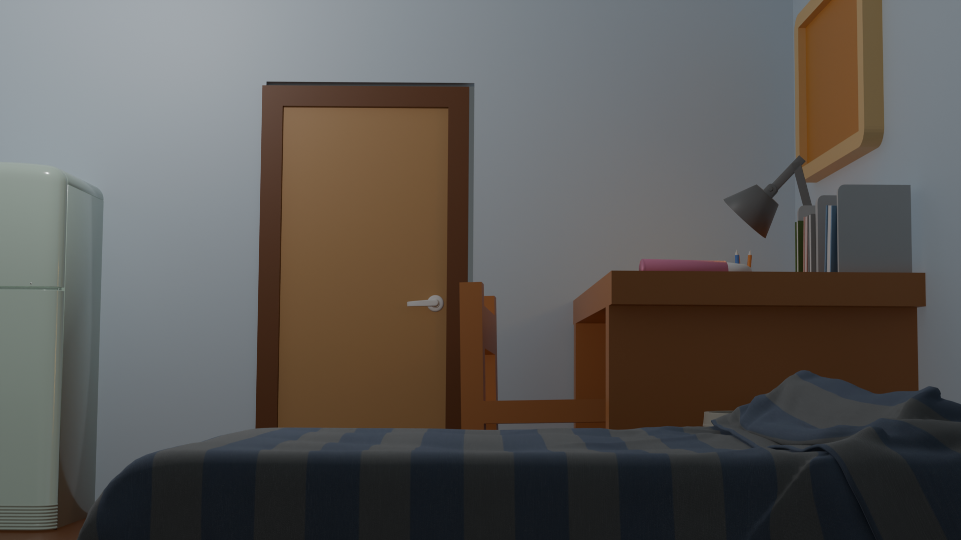 일반적인 책상, 자고 일어나서 볼 수 있는 침대에서의 시점과 물로 가득 찬 집입니다
